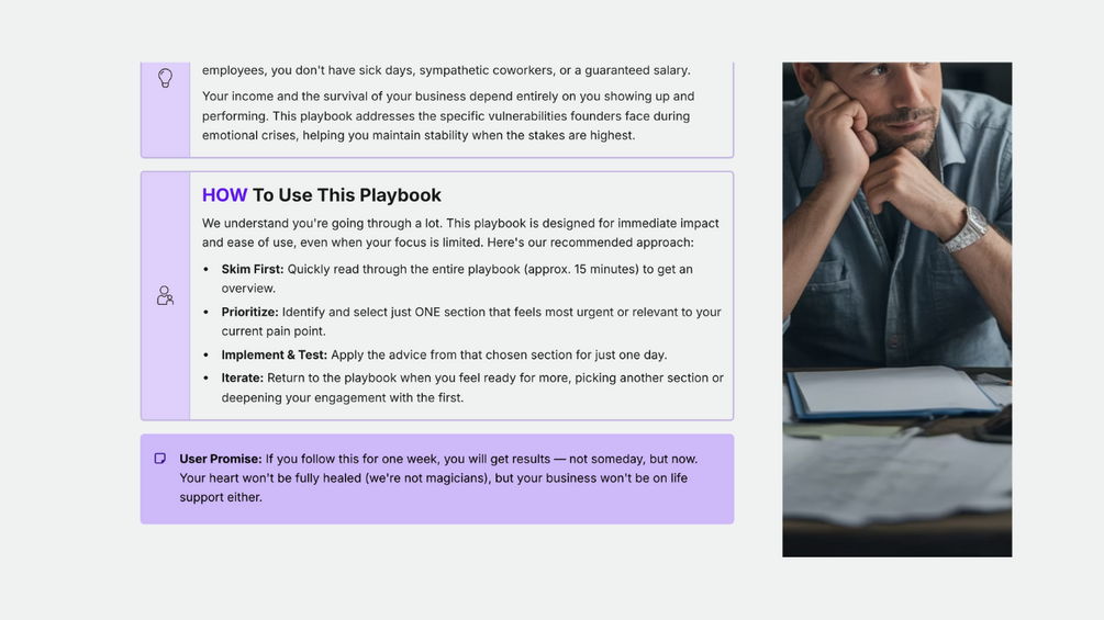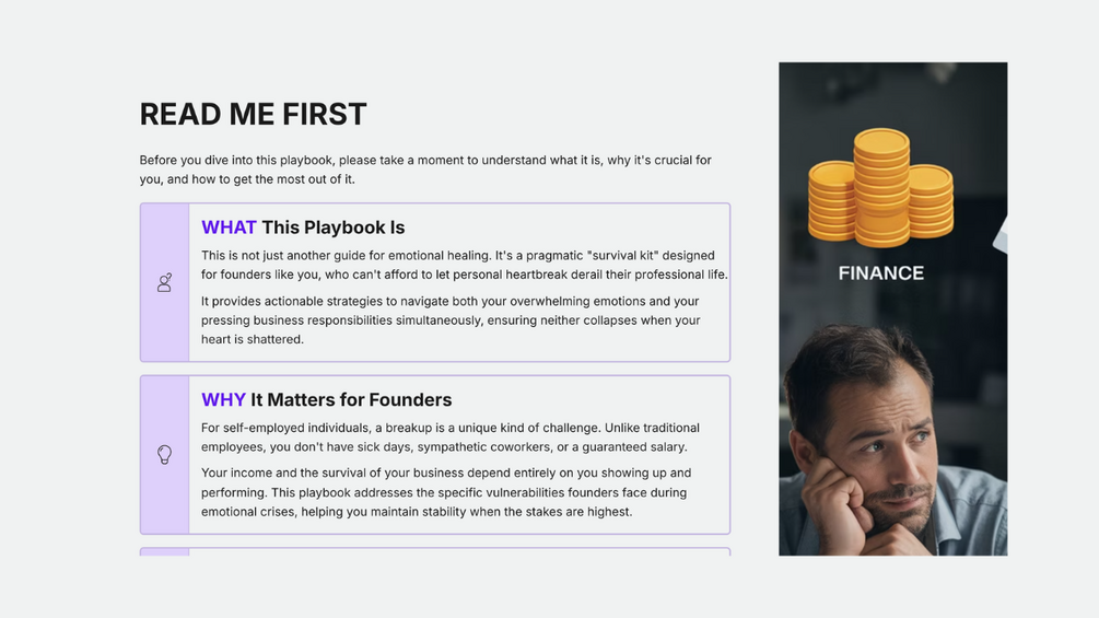 The Breakup & Burnout Recovery Playbook for Founders is your lifeline when life hits hardest. Instead of letting heartbreak or burnout destroy your focus (and your business), you’ll have a clear system to heal, reset, and move forward — without dropping the ball on what matters most. Because your heart needs time, your brain needs rest - but your business still needs you. This playbook helps you give all three what they need.