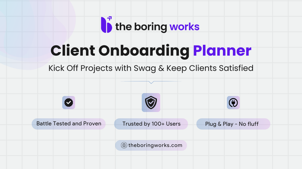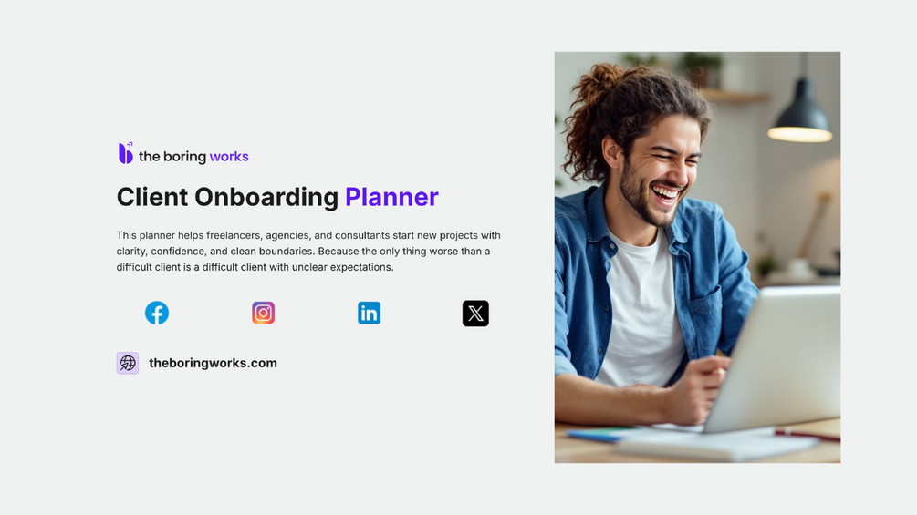 The Client Onboarding Planner is your project’s bouncer: it keeps chaos outside and lets only professionalism through the door. With it, you’ll set boundaries, manage expectations, and finally stop firefighting.