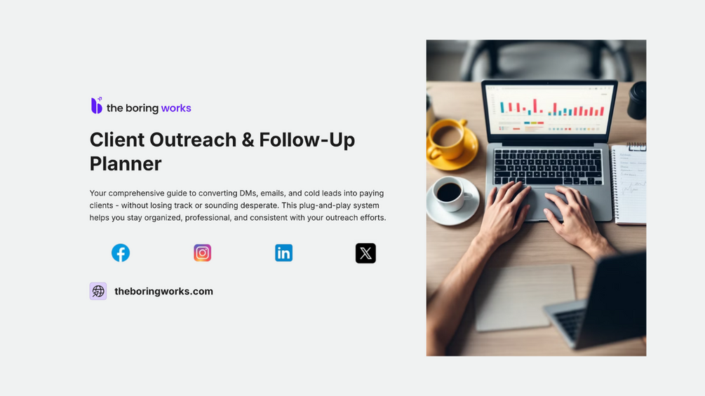 Enter the Client Outreach & Follow-Up Planner. Your new lead-handling sidekick that keeps track of every prospect, reminds you when to follow up, and stops you from ghosting or stalking anyone. It’s like having a personal assistant that doesn’t ask for vacation days or complain about coffee.