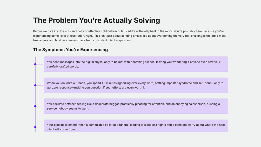 The Cold Outreach Playbook is your plug-and-play system for writing cold emails and DMs that actually get replies. No cringe. No spammy vibes. Just clear, confident messages that open doors, land meetings, and close clients — without needing a 20-step funnel or sketchy automation.