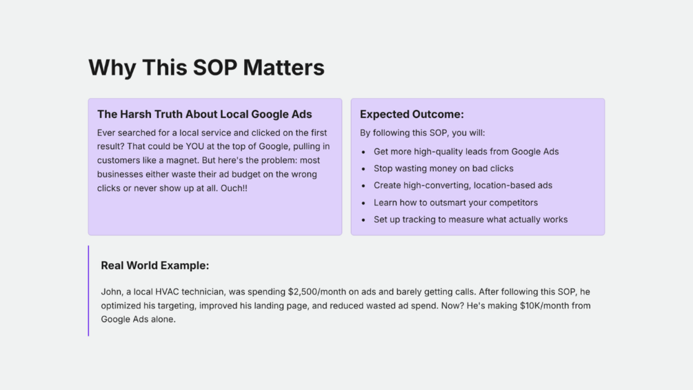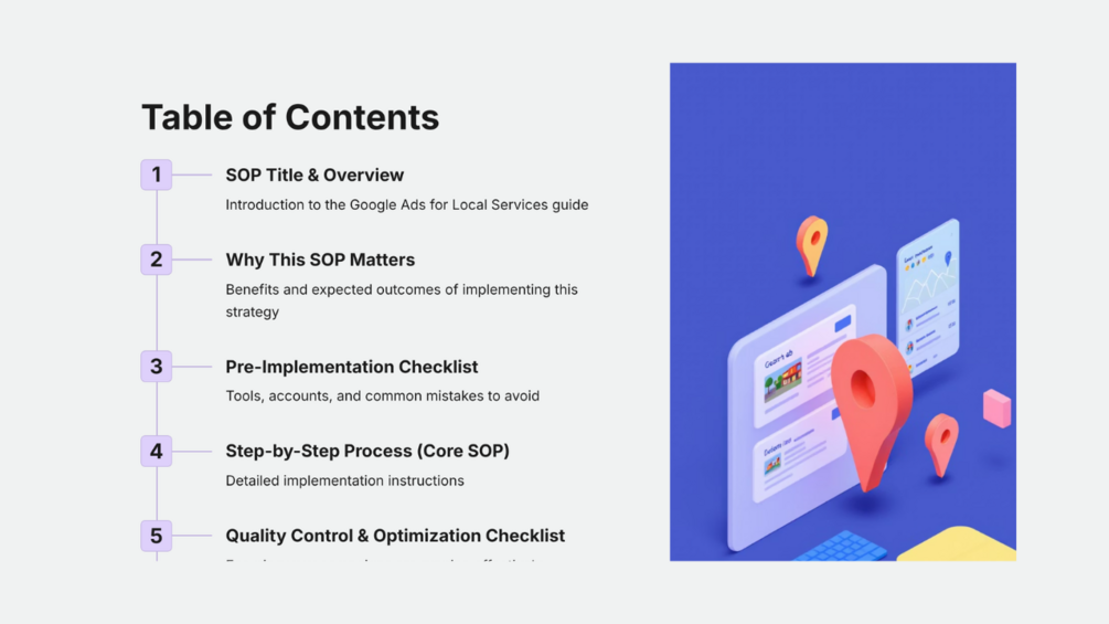 A proven step-by-step Google Ads SOP built for local services. Pre-implementation checklist (tools, accounts, common pitfalls). Quality control + optimization system to ensure campaigns perform. Pro tips & insider secrets for maximum ROI. Bonus: Next steps guide to scale your ads beyond local campaigns.